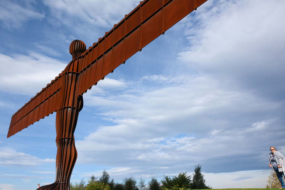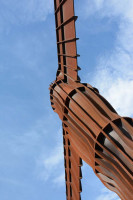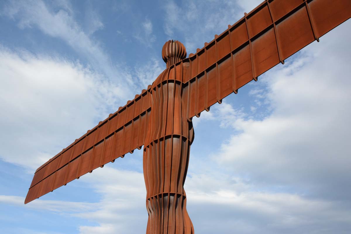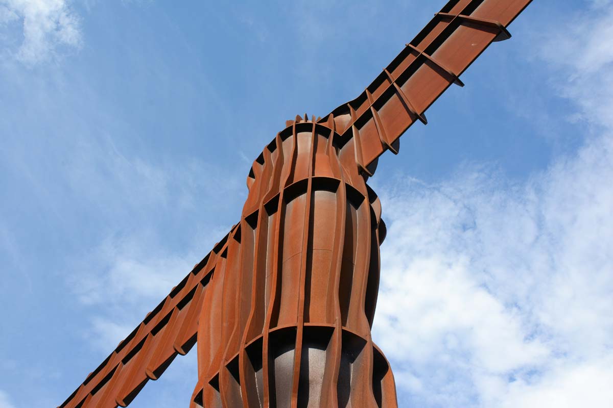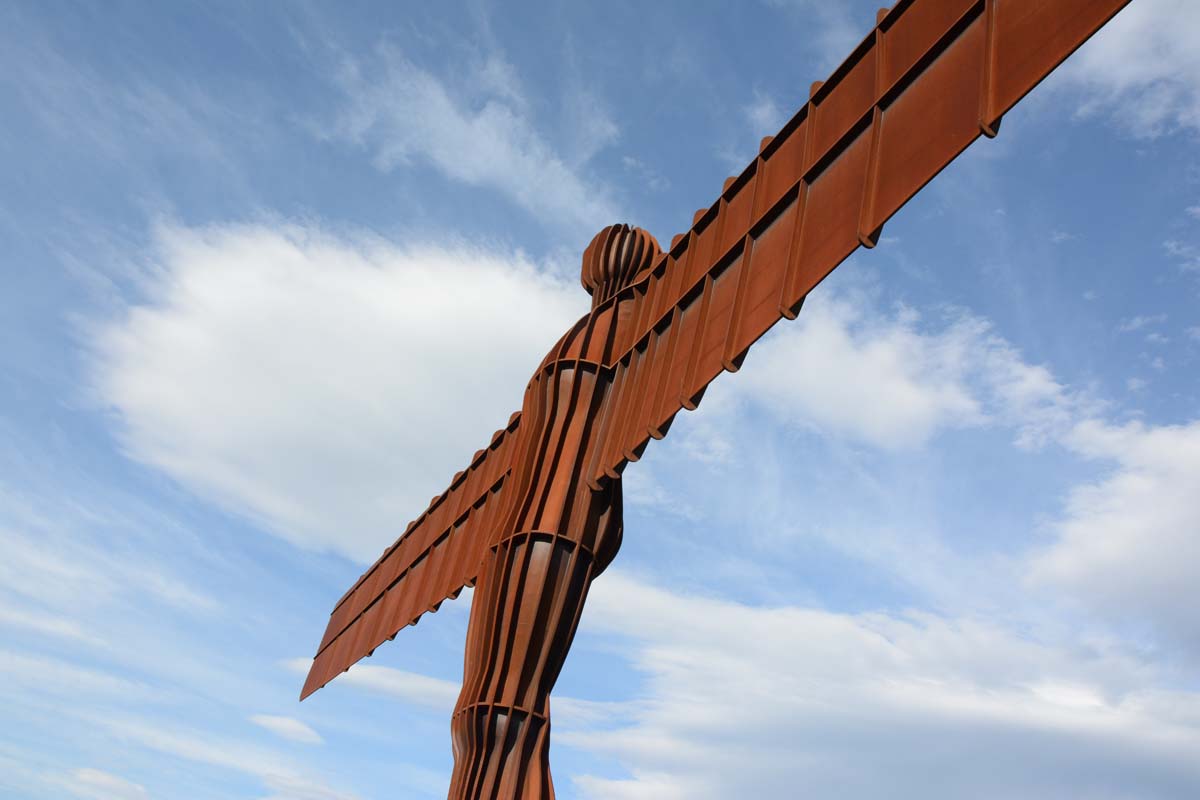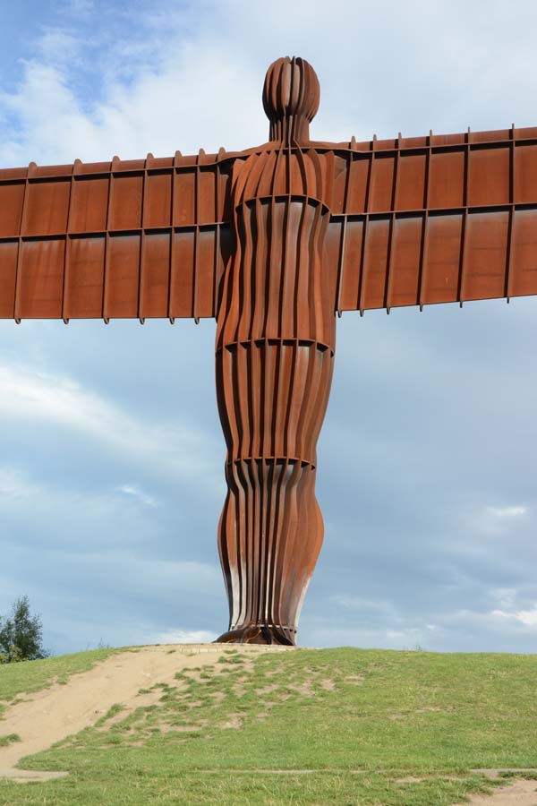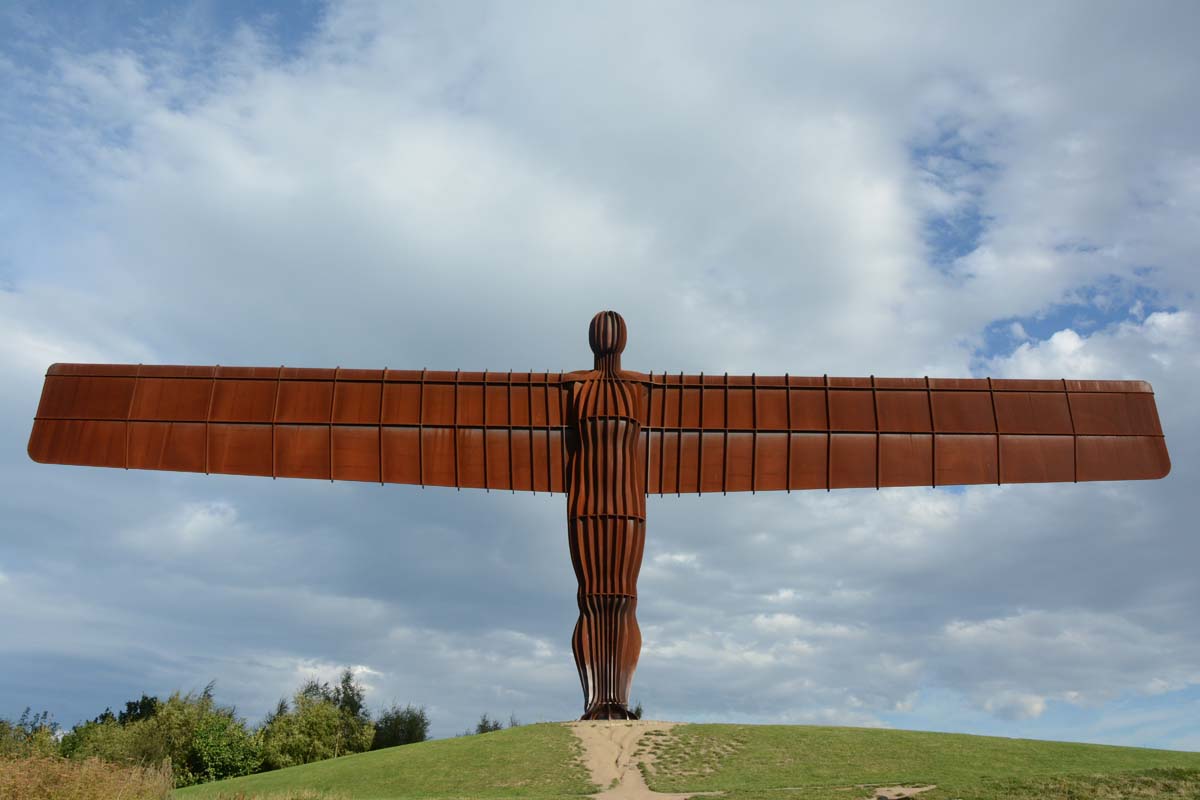 The Angel of the North is a contemporary sculpture, designed by Antony Gormley, located in Gateshead, Tyne and Wear, England. Completed in 1998, it is a steel sculpture of an angel, 20 metres (66 ft) tall, with wings measuring 54 metres (177 ft) across. The wings do not stand straight sideways, but are angled 3.5 degrees forward to create "a sense of embrace". It stands on the hill of Birtley, at Low Eighton in Lamesley, overlooking the A1.